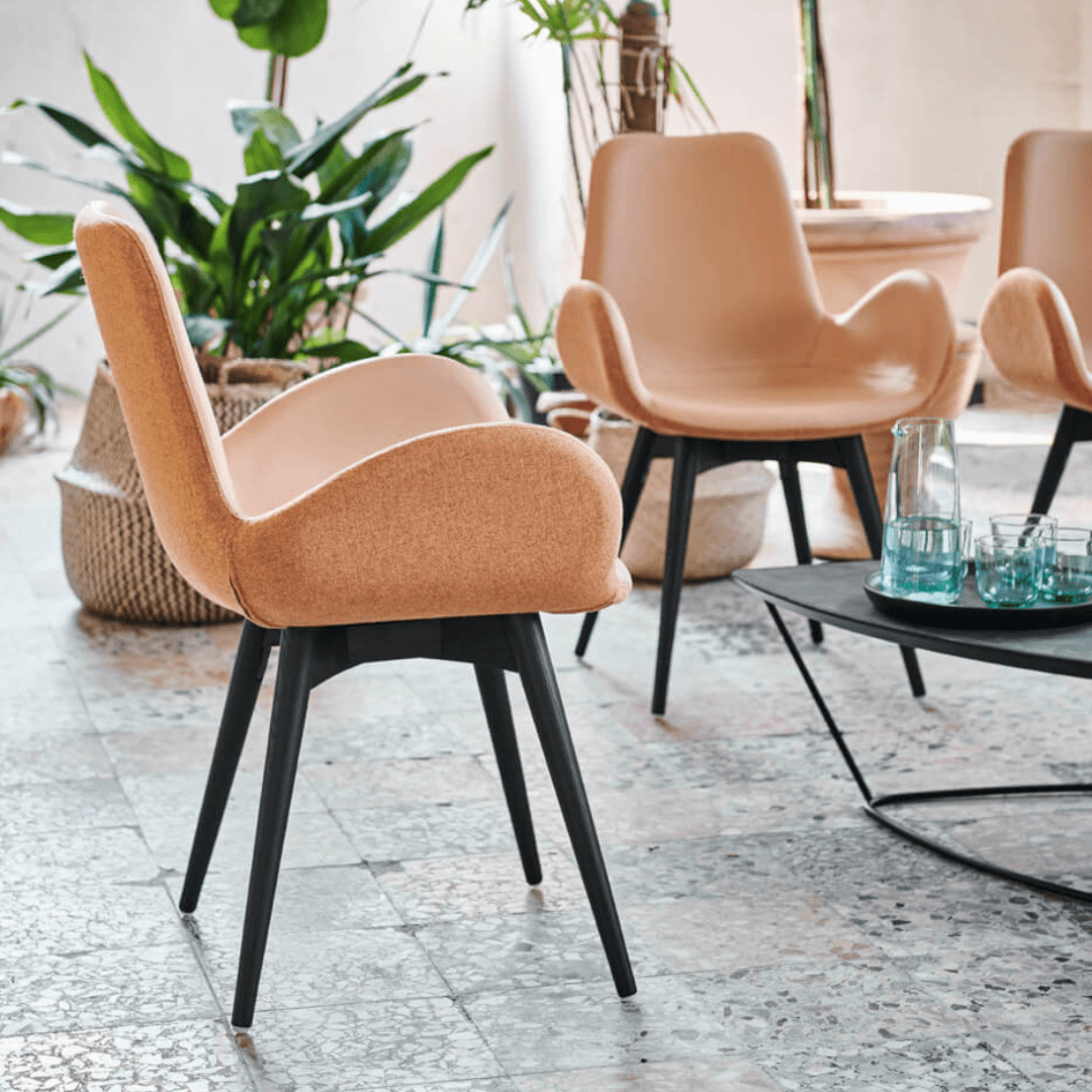 Deze stoel van italiaanse makelijk kenmerkt eenvoud en klasse. Naast de stof kan ook de voet gekozen worden