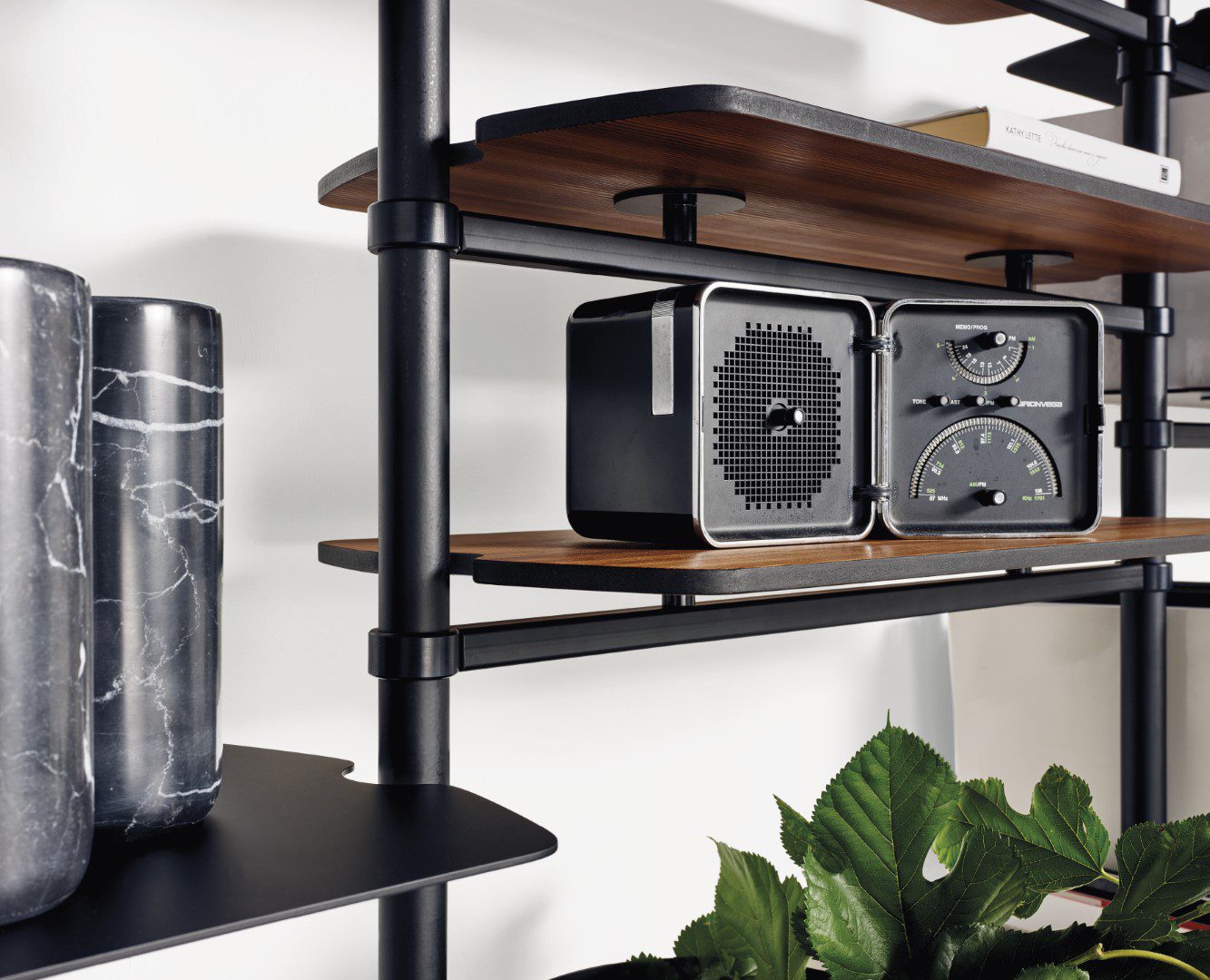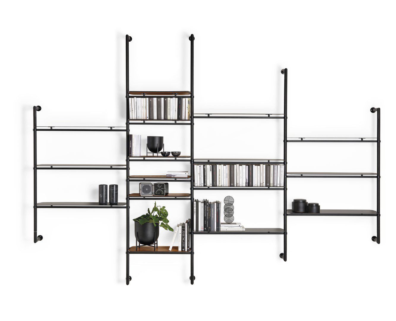 Breng stijl en flexibiliteit in je interieur met **Levante**, een modulaire boekenkast van **Mogg**. Gemaakt van matzwart gelakt metaal en verkrijgbaar met plafond- of wandbevestiging, past deze kast perfect in elke ruimte – van de woonkamer tot de home office.