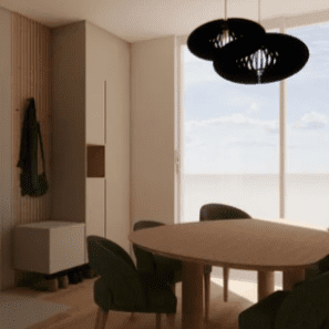 Deze ingebouwde vestiairekast werd volledig op maat ontworpen en subtiel ingebouwd in de wand. De combinatie van greeploze deuren, warme houtaccenten en verticale latstructuur zorgt voor een stijlvolle en functionele oplossing in de inkom- of eetruimte.