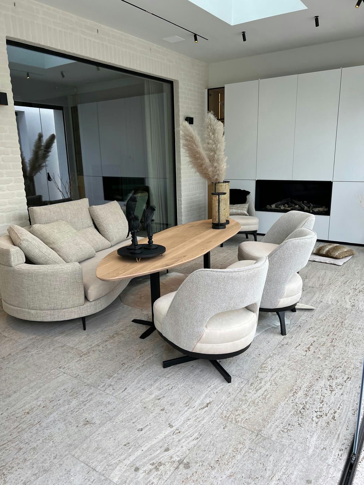 We werken in deze reeks zitbanken vaak met gebogen vormen dewelke dit meubelstuk de ideale plek voor ontspanning en gezelligheid maakt.